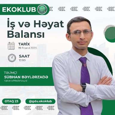 19.02.2025-ci il tarixində saat 1200-da “Ekoklub”-un Ekologiya və təbiəti mühafizə kafedrasında açılışı keçirildi. Açılışa beynəlxalq sertifikatlı karyera məsləhətçisi, Təkamül Akademiya MMC-nin təsisçisi və direktoru, şəxsi inkişaf üzrə mentor Sübhan Bəylərzadə dəvət olunmuşdur. Təxminən bir saatdan artıq davam edən görüşdə Sübhan Bəylərzadə tərəfindən tələbələrə uğurlu karyera qurmağın yolları barədə ətraflı məlumat verildi. Məruzəçi sonda aktiv tələbələri mükafatlandırdı və şəxsi karyeralarını qurmaqda onlara yaxından köməklik göstərəcəyini vurğuladı.