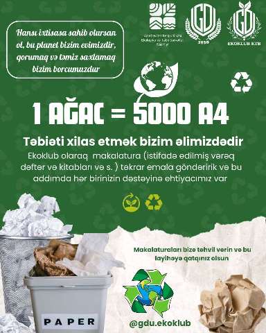 İştirak və dəstək: Layihəyə qoşulmaq istəyən tələbə və müəllimlər istifadə olunmuş kağızları GDU Ekoklubuna təhvil verə bilərlər. Bu proses könüllü əsasda həyata keçirilir və hər kəsin dəstəyi ətraf mühitin qorunmasına yönəlmiş bu vacib addımı daha təsirli edə bilər. Ekoklubdan çağırış: “Hansı ixtisasa sahib olursan ol, bu planet bizim evimizdir. Qorumaq və təmiz saxlamaq isə bizim borcumuzdur!” Sən də təbiətin xilasında iştirak et! Makulaturları tullamaq əvəzinə GDU Ekoklubuna təhvil verərək yaşıl gələcək üçün birgə addım at!