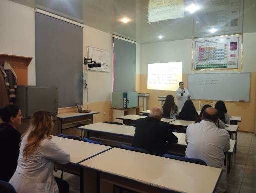 Kimya kafedrasının baş müəllimi k.ü.f.d. Vüsalə Abbasovanın Kimya mühəndisliyi ixtisasının I kursunda ”Elektrolit məhlullar. Duzların hidrolizi” mövzusunda açıq dərsi keçirildi. Açıq dərsdə kafedra müdiri dos. Aynur Məmmədova, tədris işləri üzrə dekan müavini prof. Mirzə Həsənov və kafedra əməkdaşları iştirak etdilər. Dərsdə tələbələrə elektrolitlərin dissosiasiyası və duzların hidrolizi haqqında məlumat verildi. Turşuların, qələvilərin, duzların ayrı-ayrı nümunələrinin dissosiasiyası, müxtəlif tərkibli duzların hidroliz prosesləri ətraflı izah olundu.